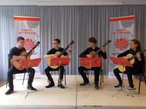 Das Gitarrenquartett Moritz Lesch, Manuel Heß, Dennis Müller und Annika Laudwein AG IV), präsentierte der fachkundigen Bundesjury am Pfingstmontag ihr ausgewähltes Musikprogramm aus den Epochen Klassik und Zeitgenössischer Musik mit Präzision und Spielfreude und wurde belohnt mit einem 3. Bundespreis.